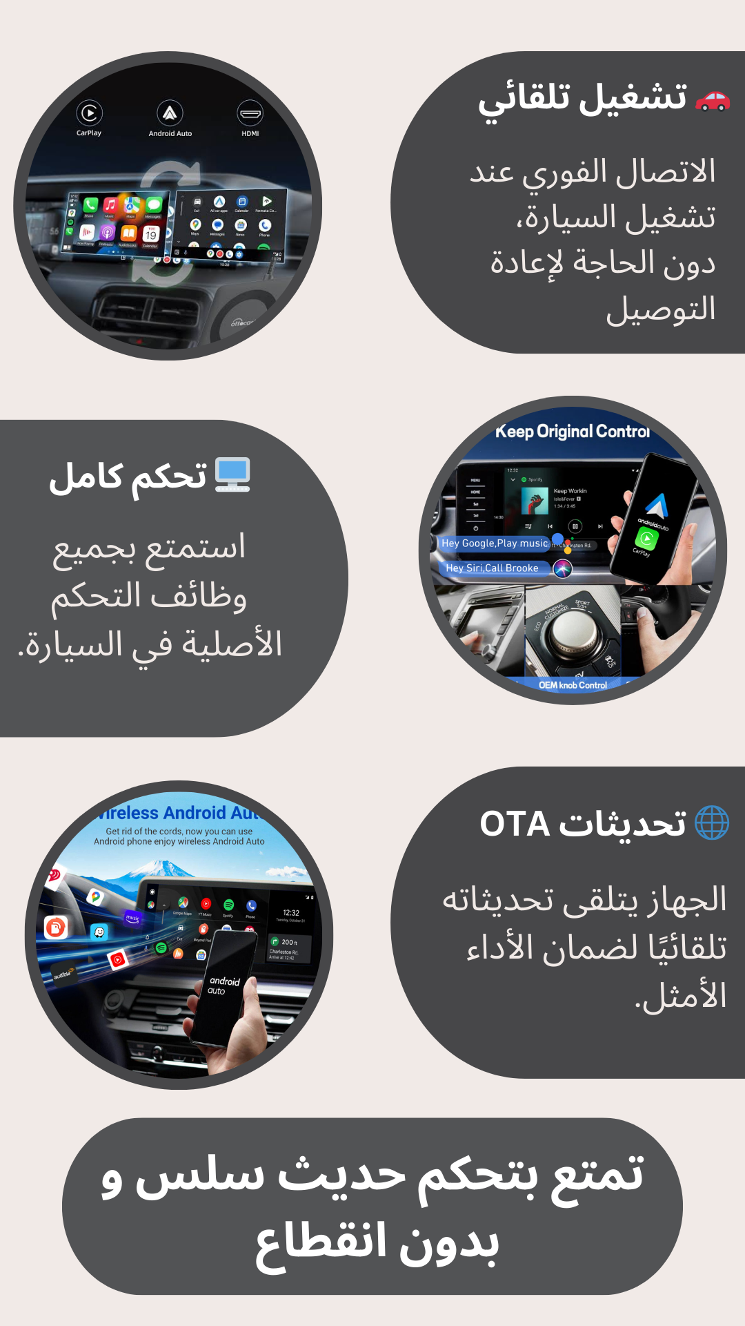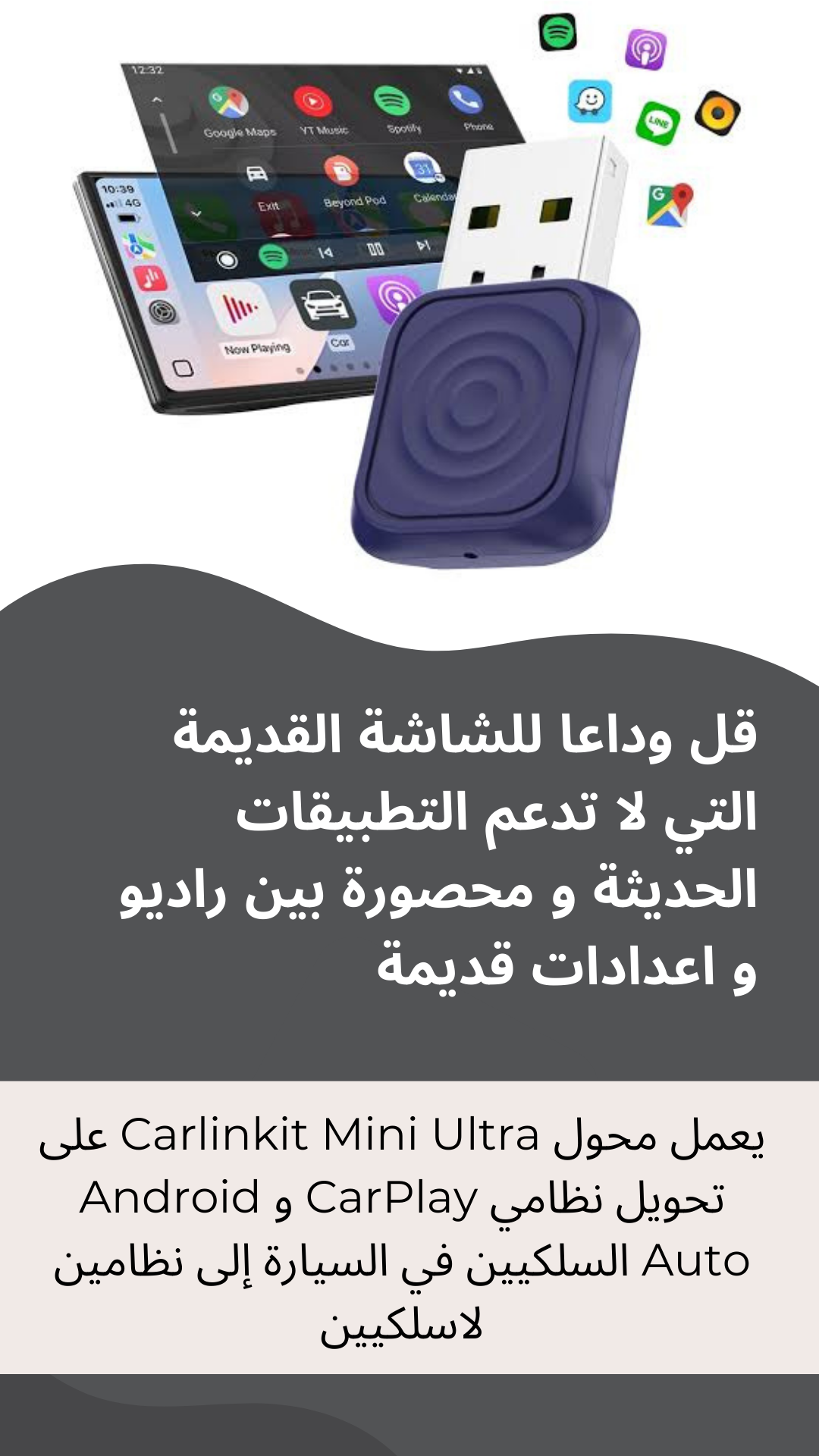 هذا محول CarPlay لاسلكي يُمكّنك من تحويل نظام CarPlay أو Android Auto السلكي في سيارتك إلى نظام لاسلكي بكل سهولة. يكفي توصيله بمنفذ USB ليعمل تلقائيًا دون الحاجة إلى أي إعدادات معقدة. يوفر اتصالًا سريعًا ومستقرًا يسمح باستخدام تطبيقات الملاحة مثل Google Maps، وتشغيل الموسيقى من Spotify وYouTube Music، وإجراء المكالمات والرد على الرسائل بأمان أثناء القيادة. يتميز بحجمه الصغير وتصميمه العملي، ولا يؤثر على أداء النظام الأصلي للسيارة، مما يجعله حلًا مثاليًا لمن يبحث عن الراحة والتنظيم وتجربة قيادة أكثر سلاسة دون أسلاك.