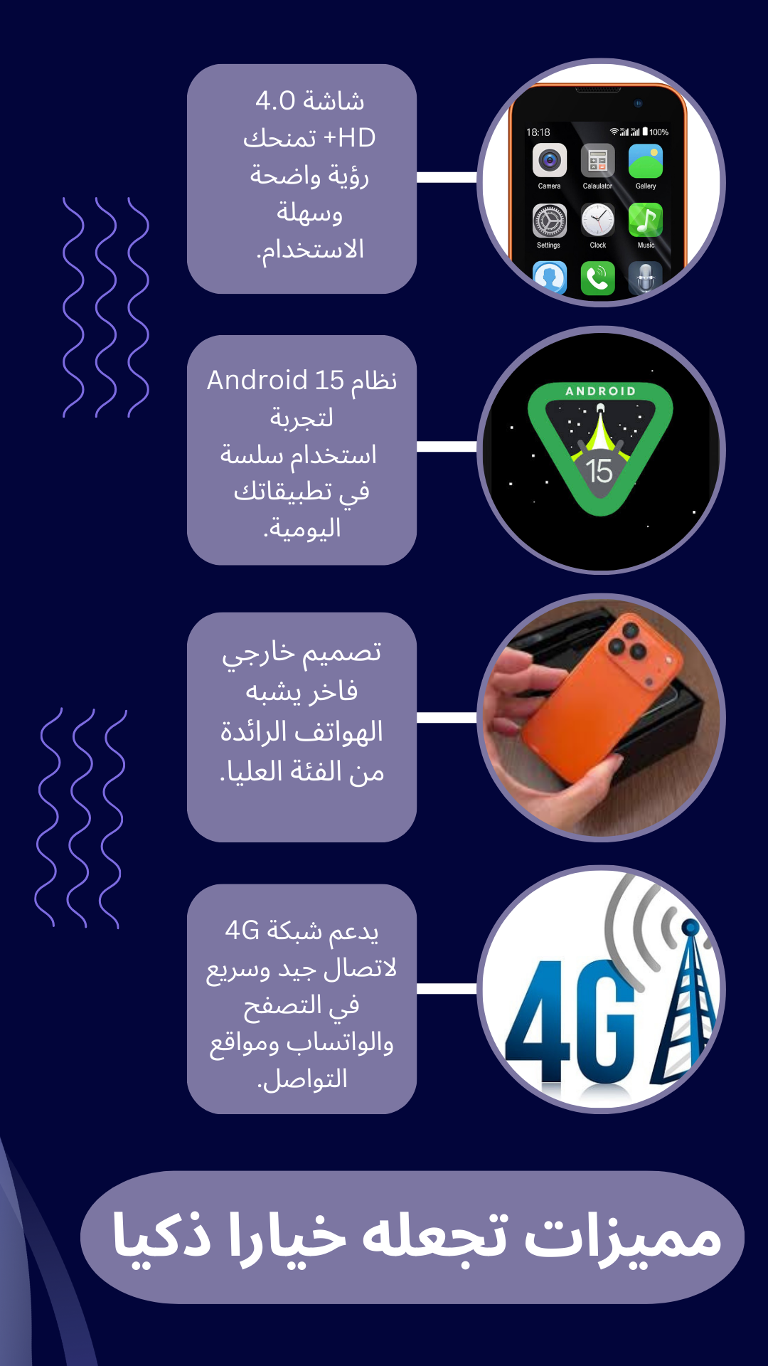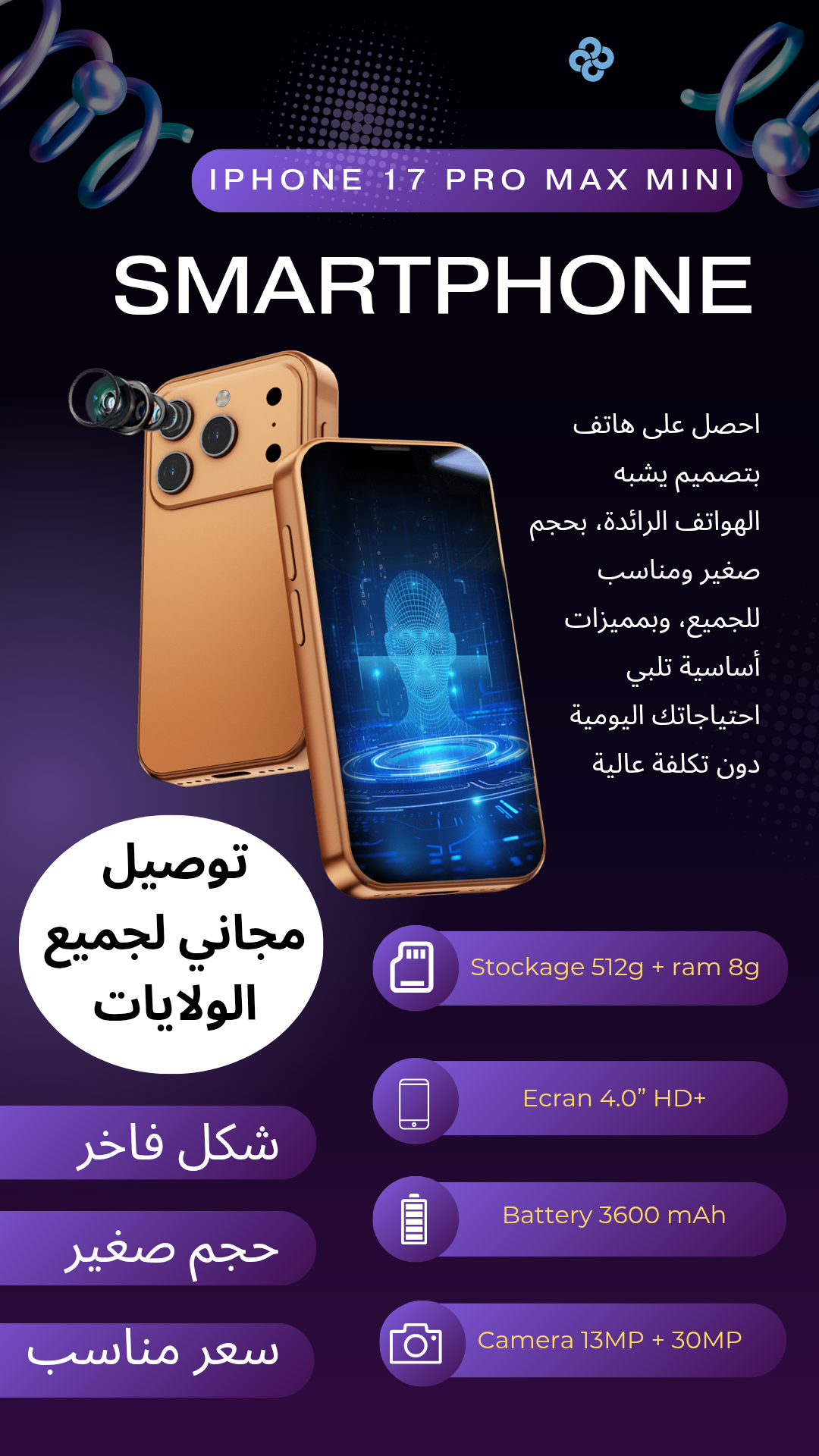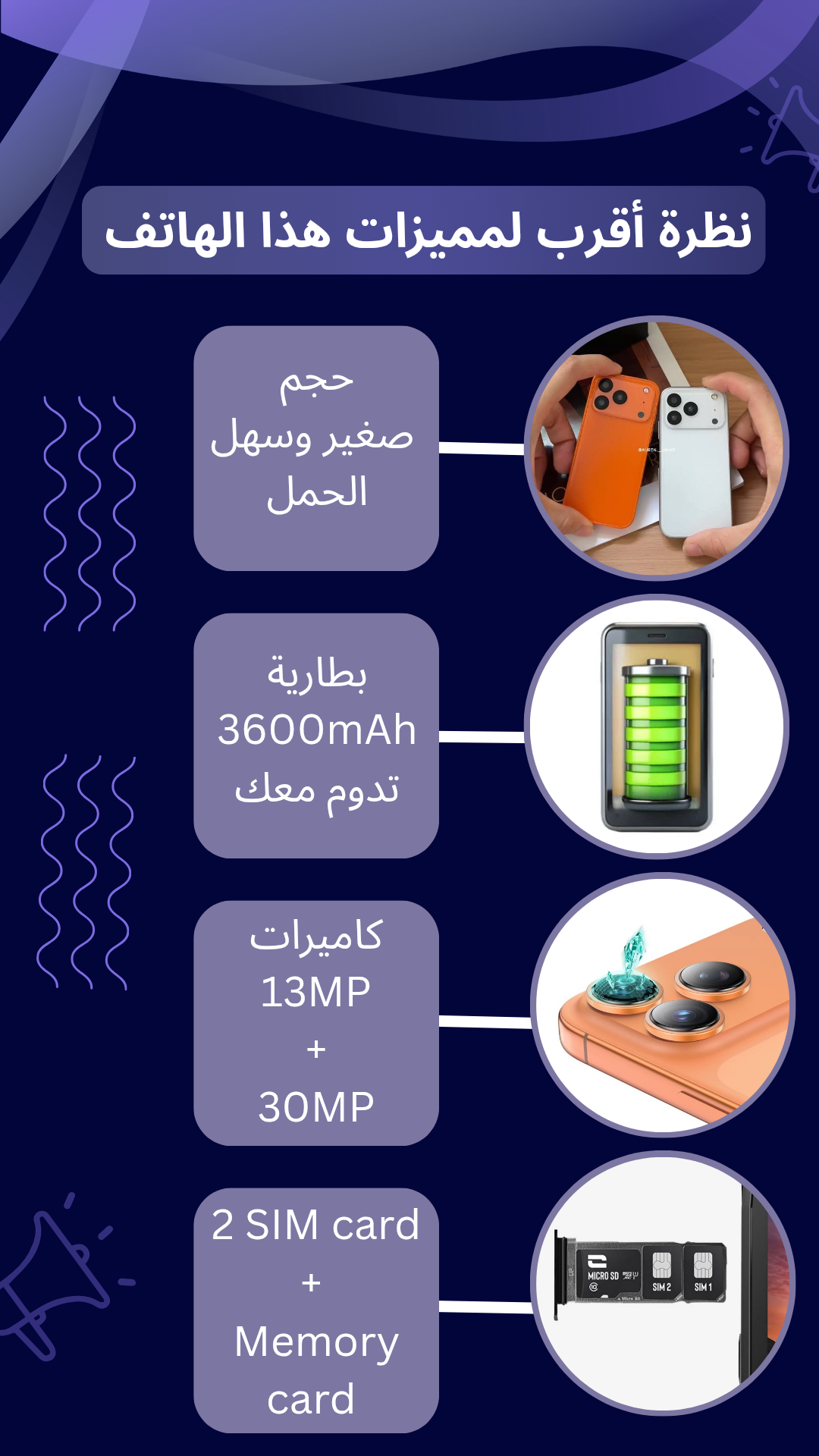 هاتف 17 Pro Max هو جهاز ذكي صغير الحجم بتصميم خارجي يشبه أحدث الهواتف الفاخرة، لكنه يأتي كخيار اقتصادي يجمع بين الشكل العصري والوظائف الأساسية. يتميز بشاشة 4.0 بوصة HD+، وبطارية 3600mAh مناسبة للاستخدام اليومي، ويعمل بنظام Android 15 لتجربة سلسة. يأتي بكاميرات 13MP + 30MP تمنحك صورًا مقبولة في فئته، مع تصميم جذاب وخفيف يُسهل حمله في الجيب، مما يجعله مثاليًا للأطفال، أو كهاتف ثانوي، أو لمن يبحث عن هاتف بسيط بمظهر فاخر دون تكلفة عالية.